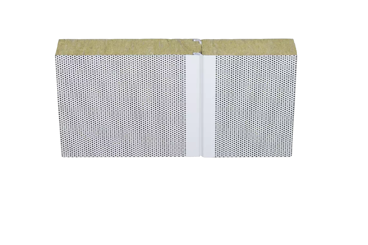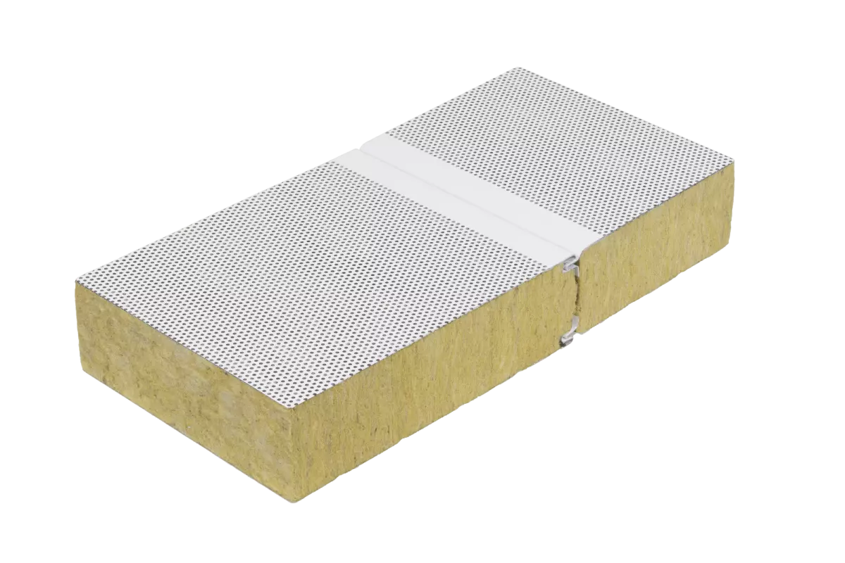 Hipertec Wall Sound est un panneau sandwich métallique autoportant avec une isolation en laine de roche de haute densité. Sa face intérieure perforée lui permet d’améliorer l’isolation et l’absorption acoustiques des locaux dans lesquels il est utilisé. Principalement adapté pour les murs et les plafonds à l’intérieur d’un bâtiment, le panneau peut également être utilisé comme bardage extérieur dans certains cas bien précis (nous consulter). Il se compose d’une tôle extérieure en acier, d’une isolation en laine de roche à fibres dressées, d’un voile de verre et d’une tôle intérieure perforée en acier. Les deux tôles sont galvanisées et laquées. Elles sont revêtues d’un film de protection pour éviter les salissures et les griffes durant l’entreposage, le transport et le montage.